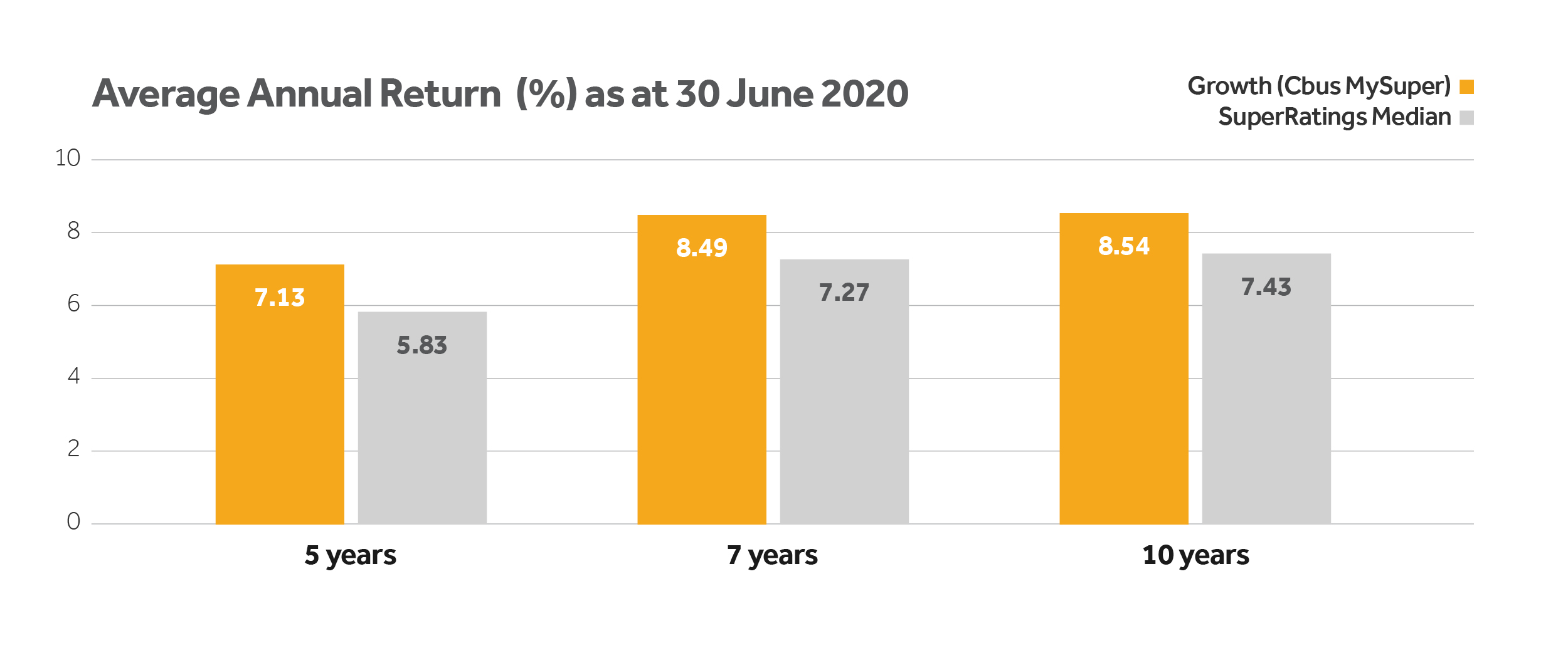 Media Super Growth (MySuper) option final declared rates and SuperRatings Fund Crediting Rate Survey - SR50 balanced (60-76) Index Median return: June 2020 (Survey data as at 19 July 2020). Past performance is not a reliable indicator of future performance. Cbus’ crediting rate is based on returns minus investment fees, taxes and until 31 January 2020, the percentage-based administration fee. Excludes fees and costs deducted directly from members’ accounts. The SR 50 Balanced Survey includes investment options that are broadly similar to the Growth (MySuper) option, as these funds are all diversified with an allocation to growth assets of between 60% and 76%.